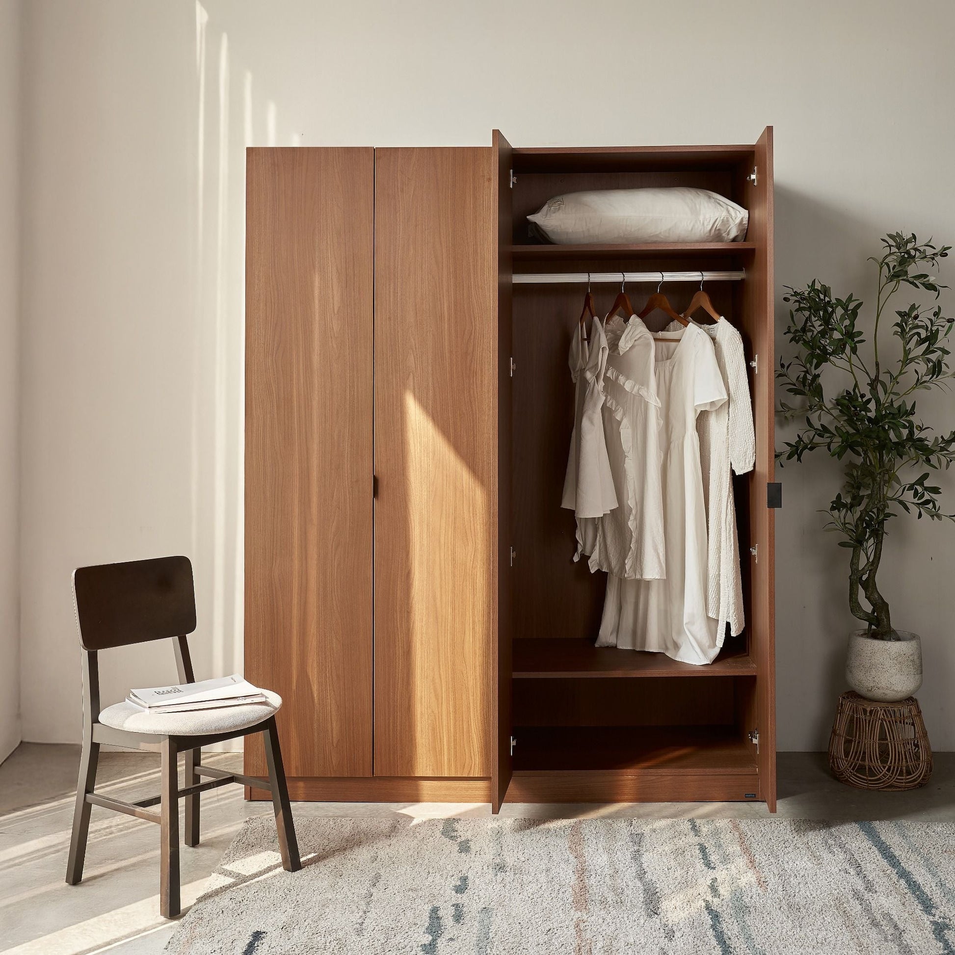 The MOHO MONZA 4-Door Wardrobe integrates Korean Minimalist and Scandinavian Modern aesthetics, emphasizing functional elegance. Constructed from CARB-P2 certified engineered wood, it ensures environmental responsibility and health safety through formaldehyde emission control. Its optimized internal layout features robust aluminum alloy hanging rails and adjustable shelves, providing versatile storage for diverse apparel and accessories. Equipped with Ivan silent hinges, the unit offers smooth, durable operation and space-saving 40cm wide door panels, ideal for compact living environments.