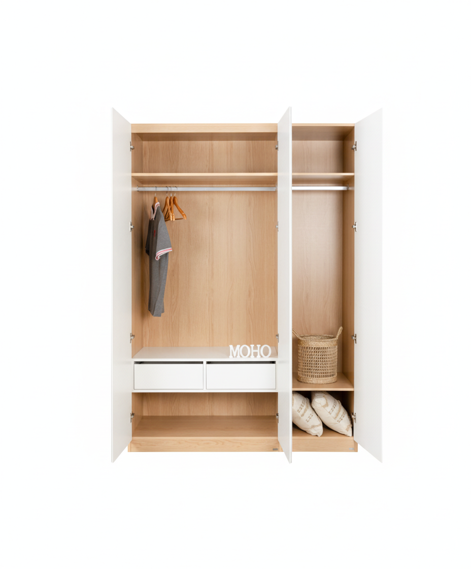 The MOHO Vienna 201 Wardrobe is constructed from CARB-P2 and FSC-certified industrial wood (PB, MDF), ensuring both user health and environmental sustainability. It features a robust, rust-resistant aluminum alloy hanging rail for garment organization. IVANs brand drawer slides and soft-close hinges provide smooth, silent operation and enhanced durability. This modular design offers optimized storage with flexible compartments, allowing for versatile configuration and potential expansion.