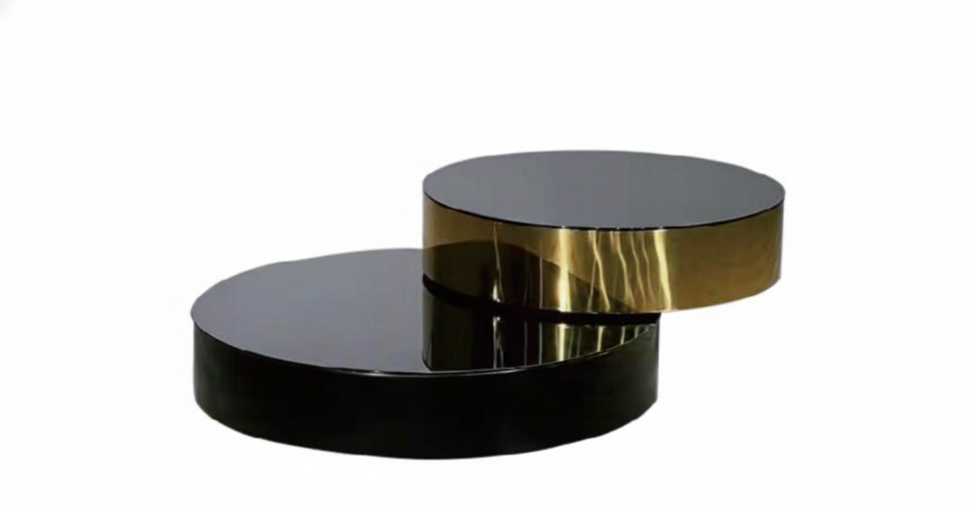 This striking two-tier coffee table is engineered for enduring sophistication, featuring a robust stainless steel frame finished with a durable, anti-corrosion electroplating in polished gold and high-gloss black. The tabletops are made from high-density, scratch-resistant tempered glass, providing a flawless reflective surface that is easy to clean and built for long-term use. The clever nested design allows the tiers to swivel for versatile arrangement, offering both functional flexibility and a seamless high-end aesthetic suited for modern living spaces.