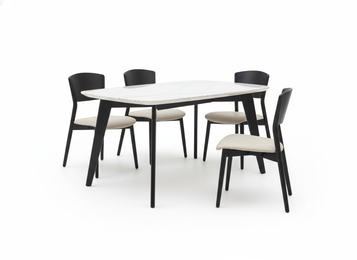 This exquisite modern dining set is built around a robust, solid ash wood frame, ensuring exceptional stability and long-lasting durability. The table features a stunning high-density faux marble top, meticulously engineered to be heat-resistant, scratch-proof, and easy to clean. The accompanying chairs are crafted from matching solid wood and feature seats cushioned with high-resilience foam, upholstered in premium, stain-resistant PU leather for superior comfort and durability. With its clean lines and contrasting black-and-white palette, this set delivers a sophisticated minimalist aesthetic that elevates any contemporary dining space.
