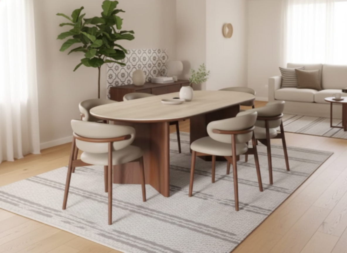 This modern dining set is built upon a robust, solid ash wood frame, ensuring exceptional stability and longevity for both the table and chairs. The expansive oval tabletop is crafted from premium, scratch-resistant sintered stone, providing a durable and easy-to-clean surface that retains its elegant finish over time. The chairs feature ergonomic curved backrests and are padded with high-density K38 resilience foam, upholstered in a sophisticated, wear-resistant performance fabric that delivers long-lasting comfort and support. With its minimalist lines, warm wood tones, and harmonious proportions, this set creates a refined and inviting dining experience suited for contemporary homes.