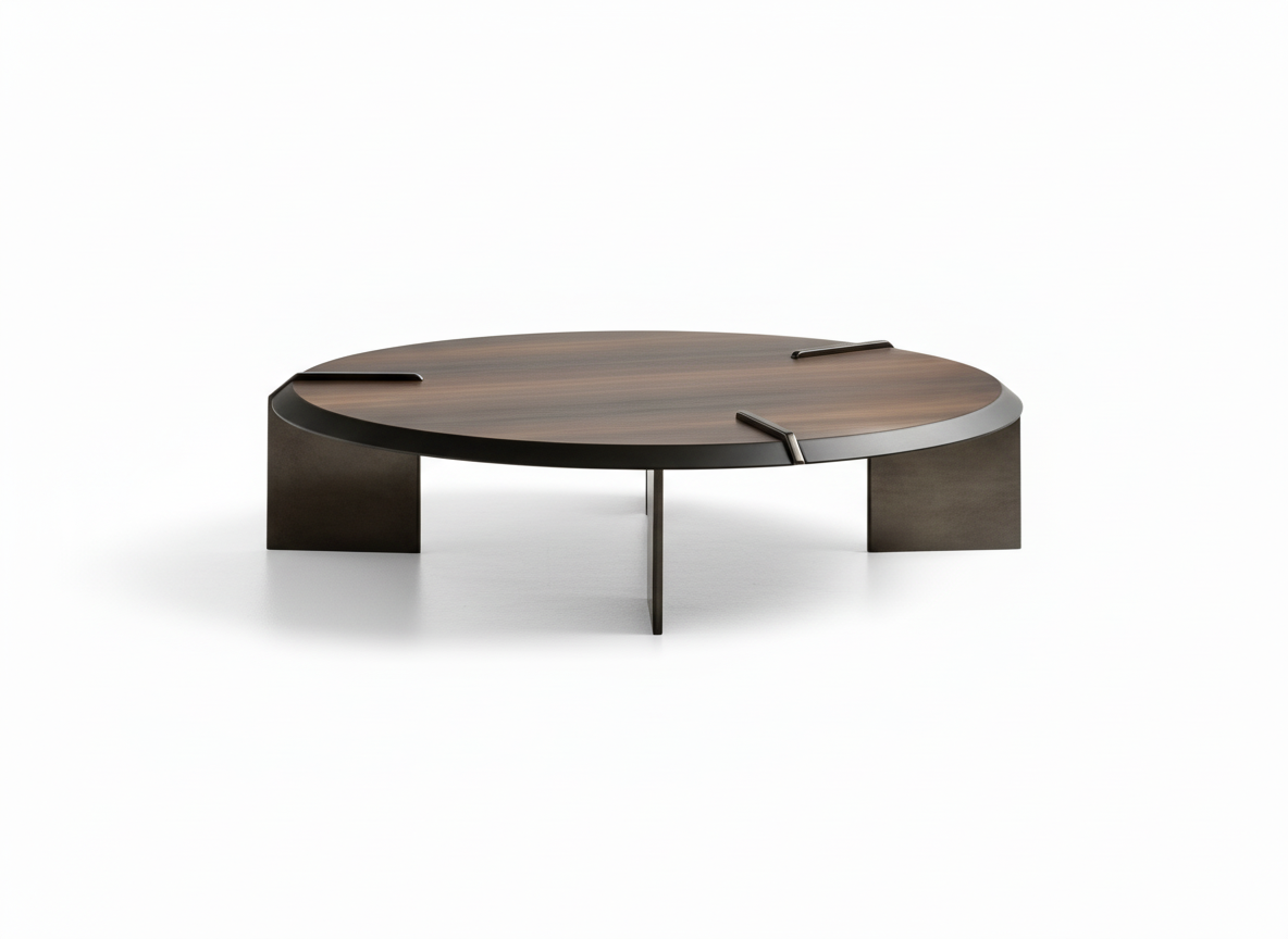 This architectural coffee table is constructed on a high-strength, precision-cut steel base finished in an elegant brushed bronze that ensures exceptional stability and long-lasting durability. The expansive circular top is crafted from kiln-dried solid ash and enhanced with a rich, multi-layered wenge veneer that resists warping, scratches, and daily wear. Inset metal accents across the surface add striking visual detail while reinforcing the structure, giving the table a refined, sculptural presence. With its floating-top illusion and interlocking base, this piece stands as a timeless centerpiece for any modern living environment.